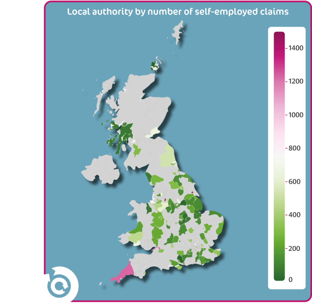 The responding local authorities were a mixture of different types from different parts of the country. The map below illustrates the local authority who responded, coloured by the number of self-employed claims they received.
