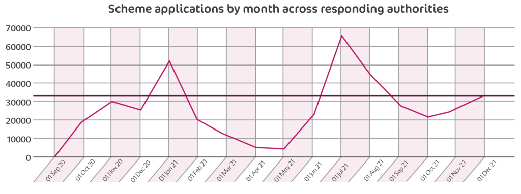 Most local authorities reported that they received their first applications for the scheme in October 2021, although a few reported having received the first applications in September.